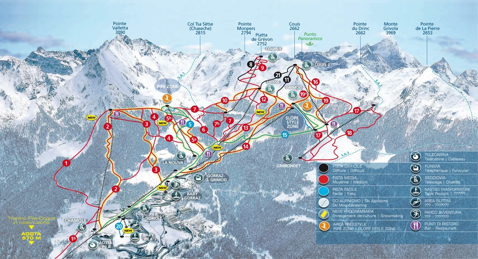 Pila jest lubianym ośrodkiem w regionie Aosty, dysponującym w przeważającej części zjazdami dla średniozaawansowanych narciarzy. Ze zboczy rozpościera się niezwykły widok na leżące u jego stóp miasto Aosta oraz okalające szczyty Mont Blanc, Grand Combin, Matterhorn i Monte Rosa. Startująca z miejscowości Aosta kolejka linowa daje bezpośredni dostęp do tras ośrodka.