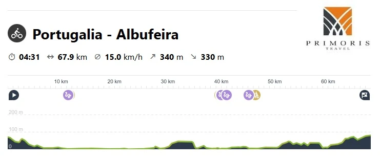 Celem naszej dzisiejszej podróży jest jedno z głównych centrów turystycznych w południowej Portugalii, miasto Albufeira. Miasto będące niegdyś niewielką rybacką wioską jest obecnie dużym, turystycznym kurortem, z wieloma hotelami i pięknymi plażami, na których również i my będziemy wypoczywać. Po zwiedzaniu i odpoczynku nad oceanem wyruszymy w drogę powrotną do hotelu. Chętni mogą wrócić tą samą trasą rowerami.