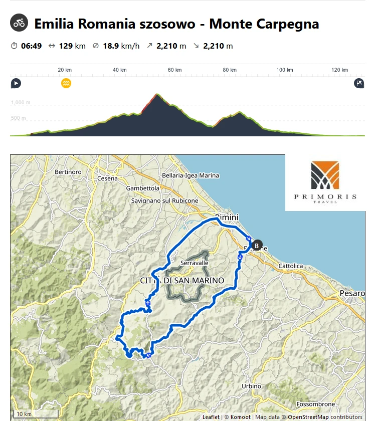 W dniu dzisiejszym wjedziemy na najsłynniejszy podjazd na którym trenował Marco Pantani. Wznosi się na wysokość 1412m n.p.m. a na jego szczyt wiedzie 6-ścio kilometrowy podjazd ze średnim nachyleniem niemalże 11%. Faktycznie przed dotarciem pod finałowy podjazd do pokonanie będziemy mieli 47km drogą, która cały czas delikatnie będzie się wznosić. W drodze powrotnej zahaczymy jeszcze o jeden niewielki podjazd, gdzie na jego szczycie, w urokliwym miasteczko zatrzymamy się na przerwę. Powrót do hotelu będzie przebiegał wzdłuż doliny, którą powoli będziemy zjeżdżali nad poziom morza.