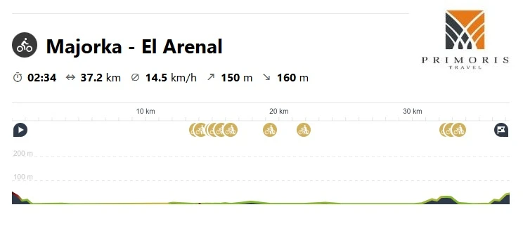 Naszą rowerową przygodę na Majorce rozpoczniemy od spokojnej jazdy po niezbyt wymagającej trasie wzdłuż wybrzeża. Podążymy trasą wzdłuż bajecznych plaż mijając znane kurorty i luksusowe kompleksy hotelowe. Będziemy poruszali się głównie wytyczonymi ścieżkami rowerowymi, a mniej wymagająca, rekreacyjna wręcz trasa pozwoli na pełen relaks i lepsze poznanie południowej części wyspy.