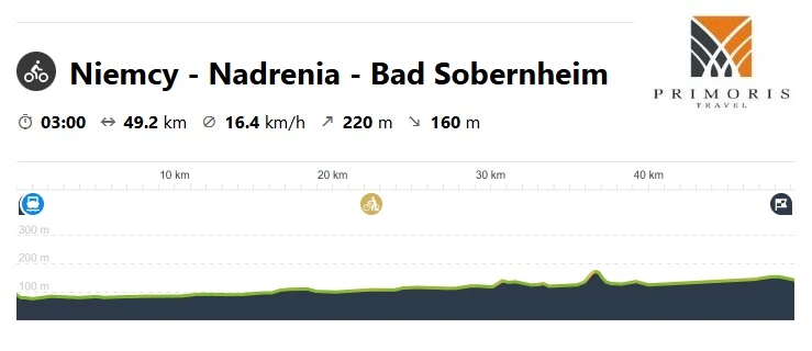 Po śniadaniu wsiądziemy na rowery i udamy się w kierunku rzeki, tutaj będziemy musieli przeprawić się na drugi brzeg. Skorzystamy z jednego z promów kursujących po Renie. Po przedostaniu się na południowy brzeg ruszymy wzdłuż rzeki Nahe na południe regionu w kierunku Bad Sobernheim. Nim dotrzemy do celu odwiedzimy między innymi Bad Kreuznach, jedno z licznych miasteczek położonych przy brzegu rzeki. Tereny, którymi będziemy się poruszali to przede wszystkim pola uprawne, małe niemieckie miasteczka i liczne winnice.