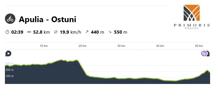 Tym razem udamy się na południowy-wschód w kierunku miasta Ostuni, które będzie naszym dzisiejszym celem. Będziemy poruszali się głównie bocznymi drogami asfaltowymi, więc ruch samochodowy nie powinien nam doskwierać. Część trasy będziemy musieli pokonać głównymi oraz szutrowymi drogami. Do pokonania mamy około 52 kilometrów, a teren po którym będziemy się poruszali będzie nieco pagórkowaty, więc nie zabraknie krótkich podjazdów, szczególnie na pierwszym etapie podróży.