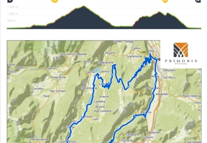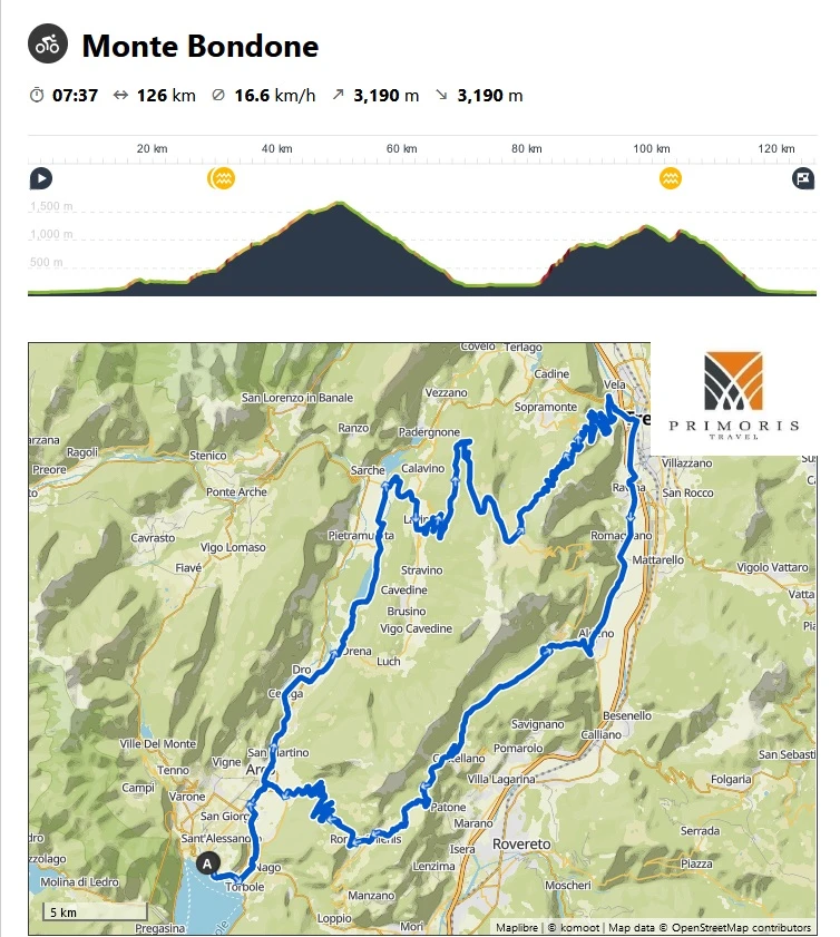 Następnie zjedziemy w kierunku Trentino, stolicy regionu i skierujemy się z powrotem ku jezioru Garda. Po drodze czeka nas już tylko wspinaczka pod Passo Bordala (14,9 kilometrowy podjazd i 4,7%średniego nachylenia) i jesteśmy z powrotem nad jeziorem Garda.
