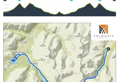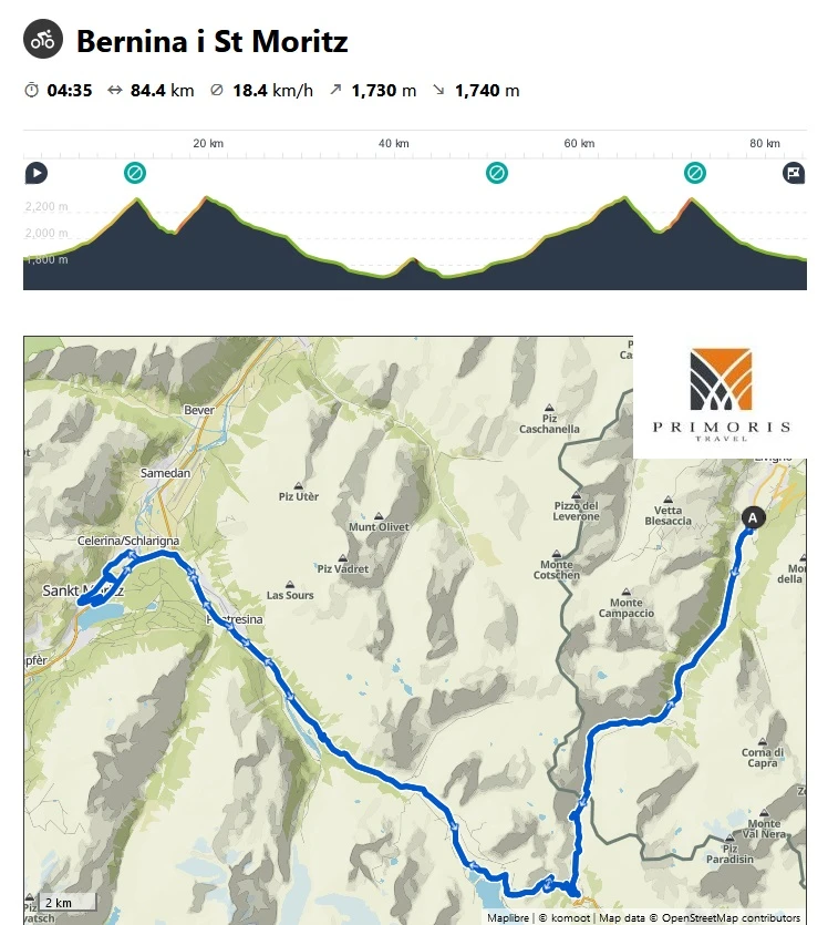 Dzień zaczniemy od 12 km podjazdu pod przełęcz Forcola (2315 m n.p.m.) ze średnim nachyleniem 4,1%. Po krótkim, aczkolwiek stromym zjeździe, wjeżdżamy do Szwajcarii i rozpoczynamy podjazd o długości 3,4km pod przełęcz Bernina (2328 m n.p.m.). Stąd już tylko 15 km zjazdu do Sankt Moritz. W drodze powrotnej pokonujemy tą samą trasę, a więc na przełęcz Bernina wjeżdżamy 15 km ze średnim nachyleniem 3,7%, a maksymalne nachylenie na odcinku 1,5km wynosi 7%. Stąd kierujemy się w stronę Włoch i przełęczy Forcoli. Zanim się na nią wdrapiemy musimy pokonać podjazd o długości 3,4 km i 253 m przewyższenia, co daje średnio 7,5% nachylenia.