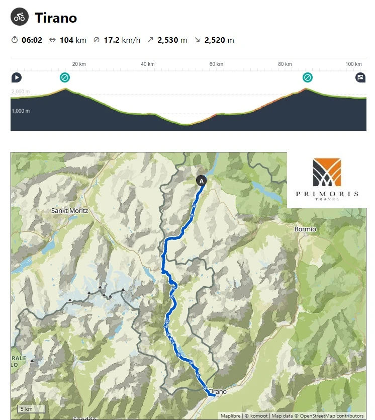 Początek trasy pokrywać będzie się z przejazdem na przełęcz Bernina, a więc pokonamy przełęcz Forcola. Dojechawszy do granicy ze Szwajcarią skręcimy w lewo i pomkniemy 35 kilometrowym zjazdem do Tirano. Tu w cieniu drzew odpoczniemy przy espresso zbierając siły na powrót.