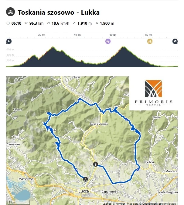 Po minięciu niegdyś tętniącego życiem Bagni di Lucca, kurortu znanego z leczniczych właściwości tutejszych wód oraz jednego z pierwszych kasyn w Europie ruszymy na Passo del Trebbio. Pokonamy pod górę 9,5km z różnicą wzniesień 600 metrów co przekłada się na średnie nachylenie 6%. Stąd zjedziemy już do Lucci na zasłużony wypoczynek.