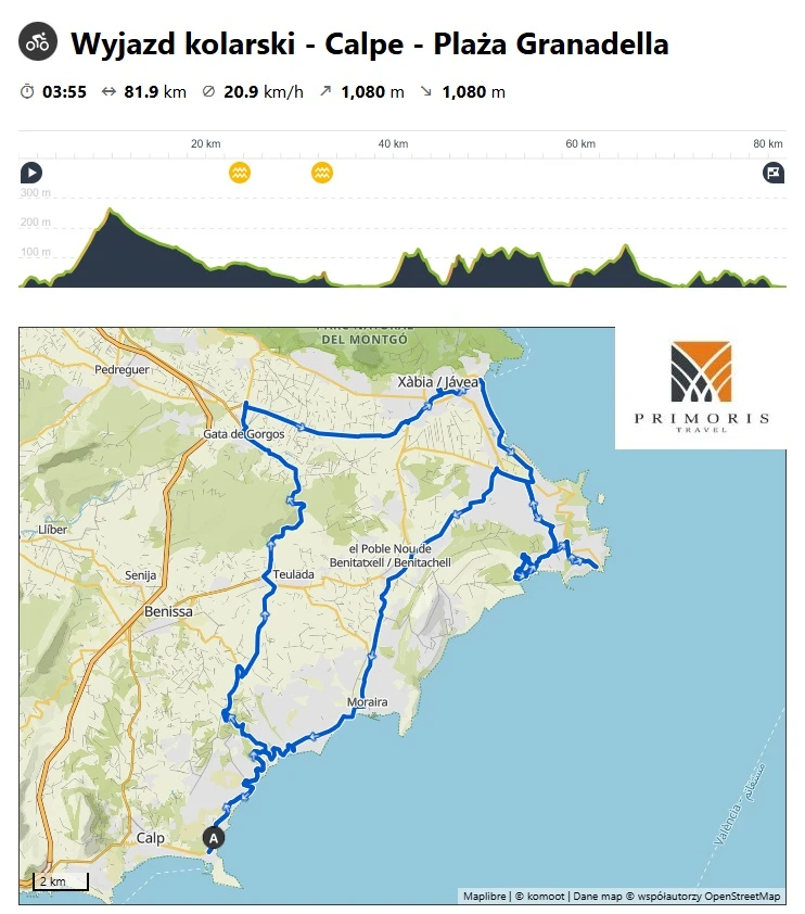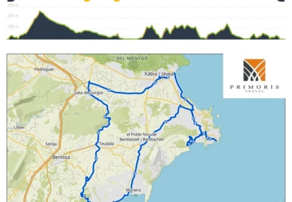 Po intensywnych trasach i wymagających podjazdach, dzień regeneracyjny na plaży Granadella będzie idealną przerwą. Trasa prowadzi przez malownicze miejscowości, oferując nie tylko odpoczynek, ale i kilka delikatnych wyzwań. Startujemy w Gata de Gorgos, znanym z tradycyjnej produkcji mebli z trzciny i wikliny, by następnie skierować się nad wybrzeże do miejscowości Xàbia. Główną atrakcją dnia będzie podjazd na przylądek La Nao i piękna plaża Granadella – doskonałe miejsce na odpoczynek przy Morzu Śródziemnym.